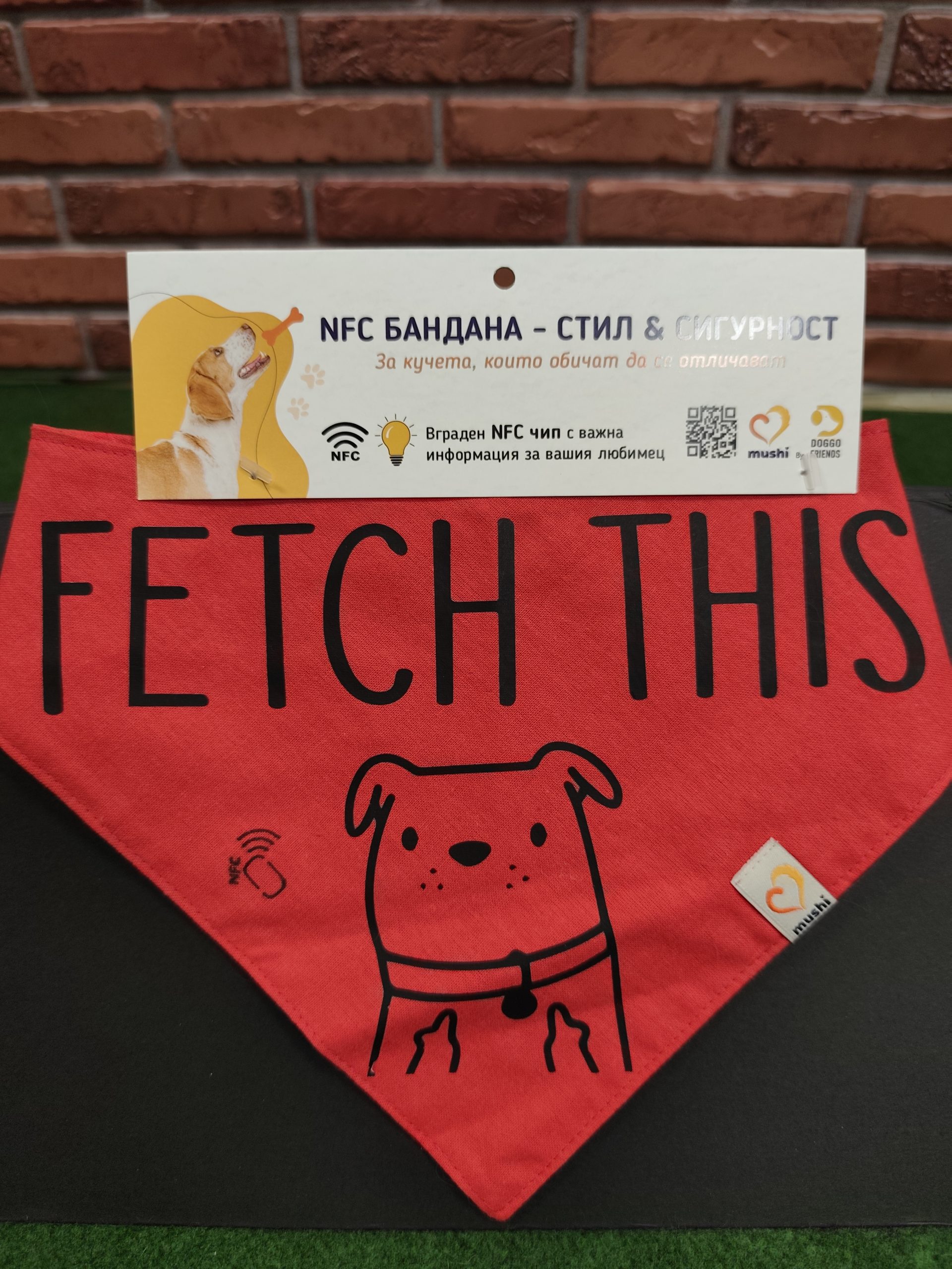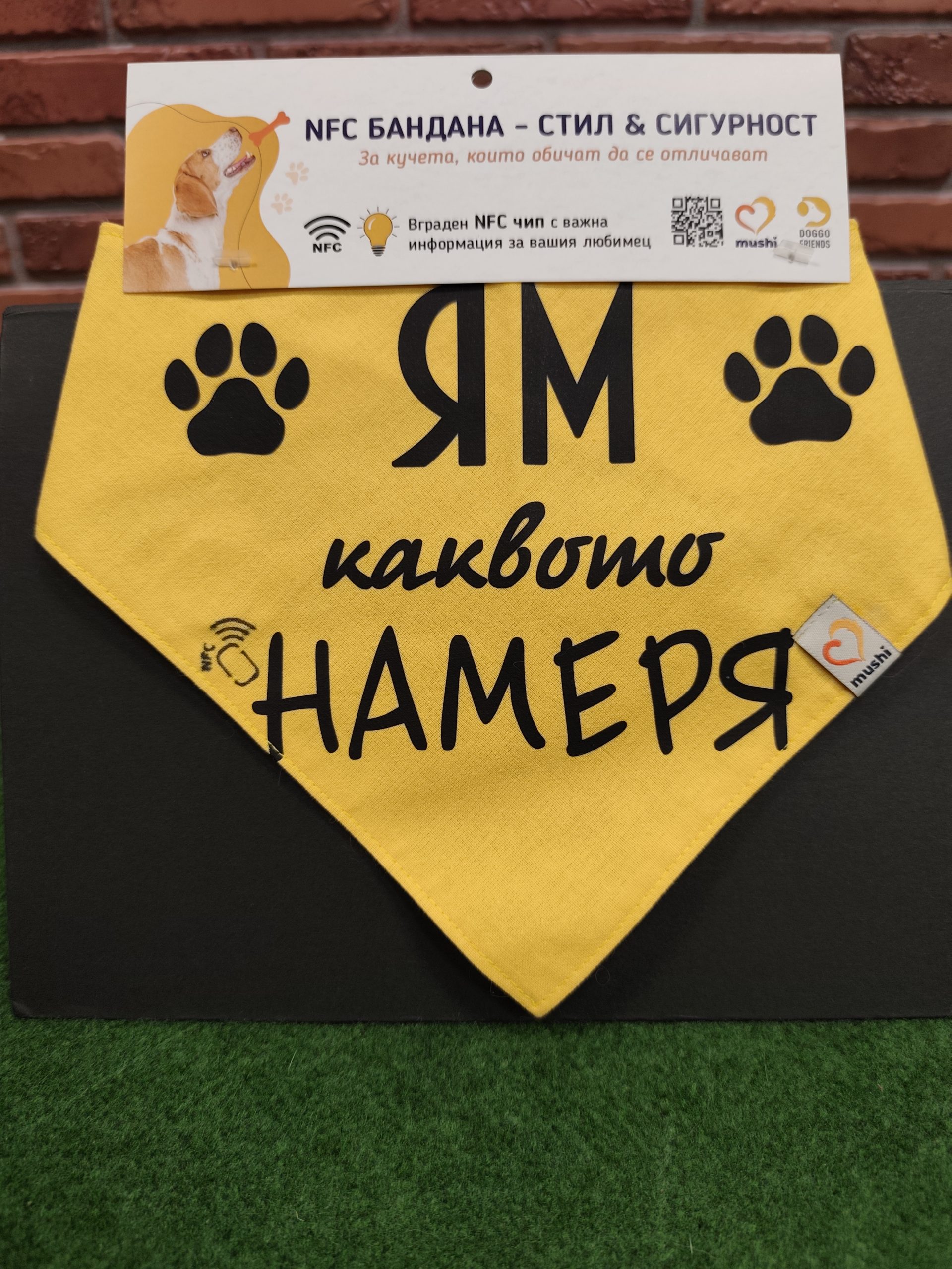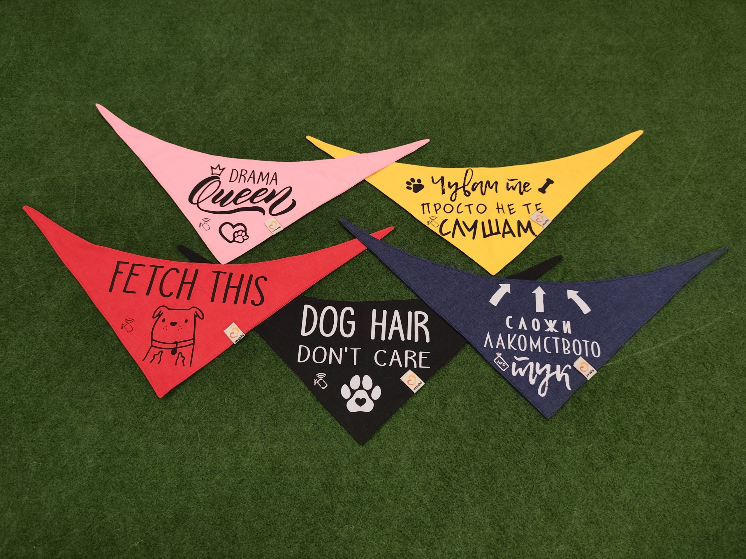 Ръчно изработена от 100% памук, нашата бандана съчетава стил, удобство и технология. Достъпна в пет основни цвята – жълт, черен, червен, син, розов, или по запитване – и в размери XS до L (XL по поръчка). Вграден NFC чип позволява съхранение на подробни данни за вашия любимец – от нрав и предпочитания до медицински спецификации, които се четат с едно докосване на телефона.