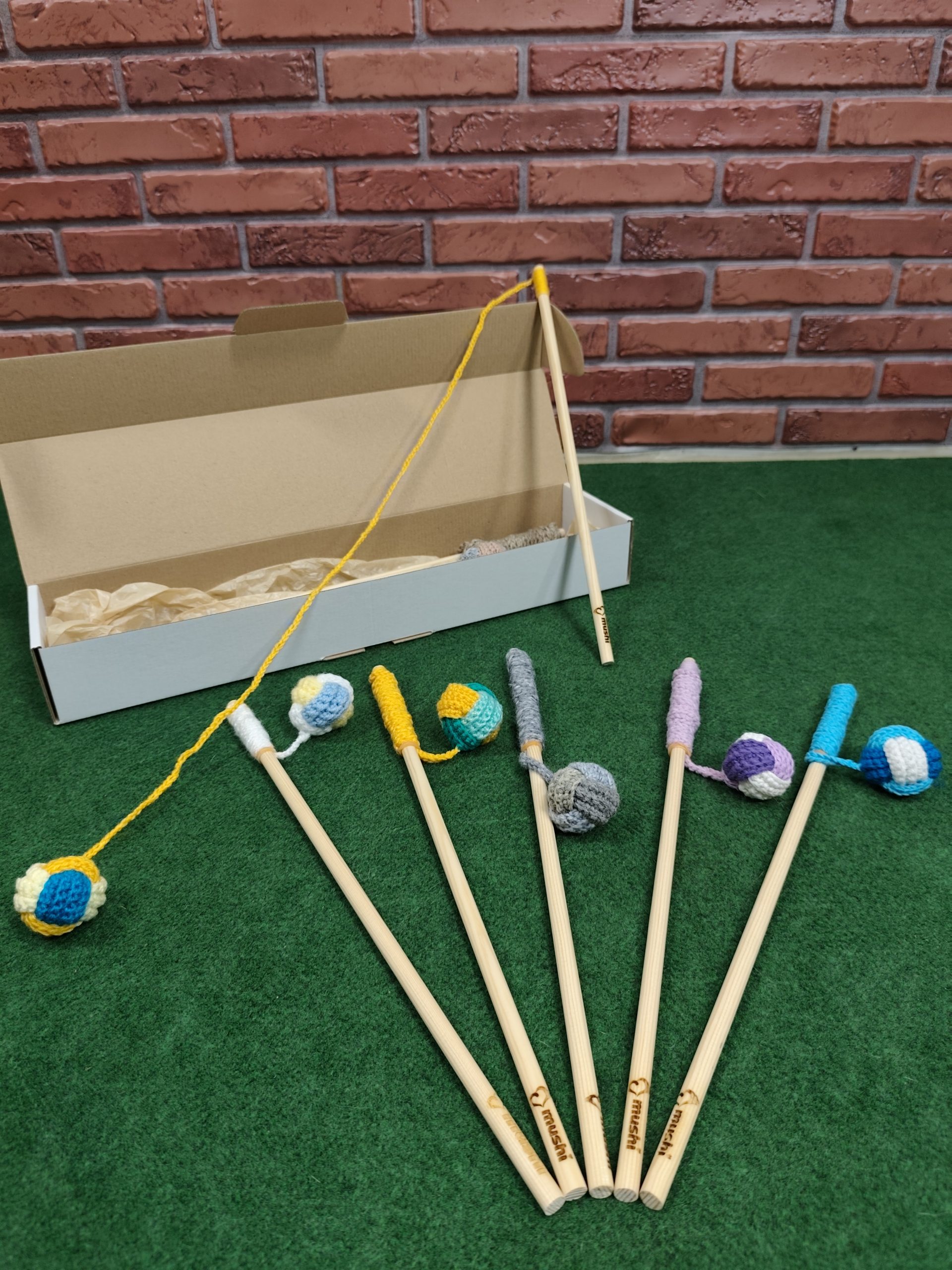 Играчката „Инстинкт за преследване“ е ръчна изработка, плетена от естествена вълна – материал, който животните обичат заради мекотата и естествената си текстура. Топката е цветна и пъстра, имитираща мишка, и е прикрепена към връв с дължина 90 см, и дървена пръчка от 40 см за по-лесно управление. Подходяща е за малки кучета и котки.
